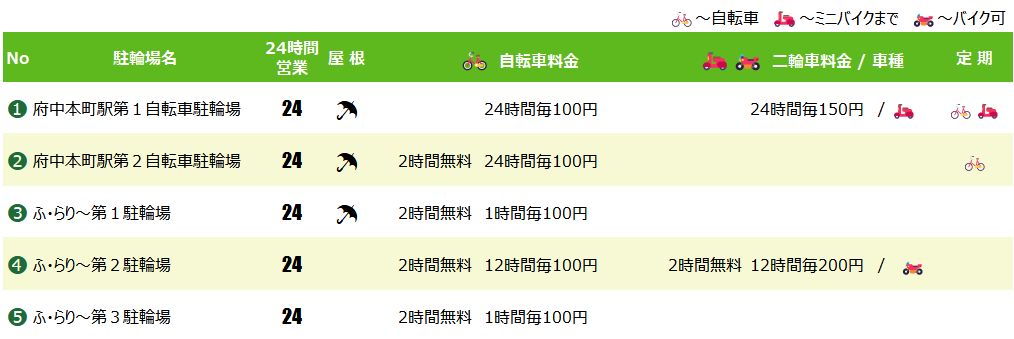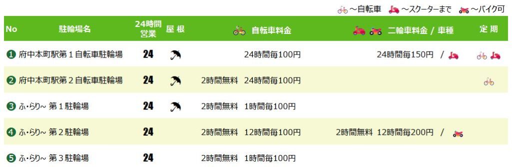 府中本町駅周辺で自転車や原付・バイクの一時/定期利用ができる駐輪場を紹介します。