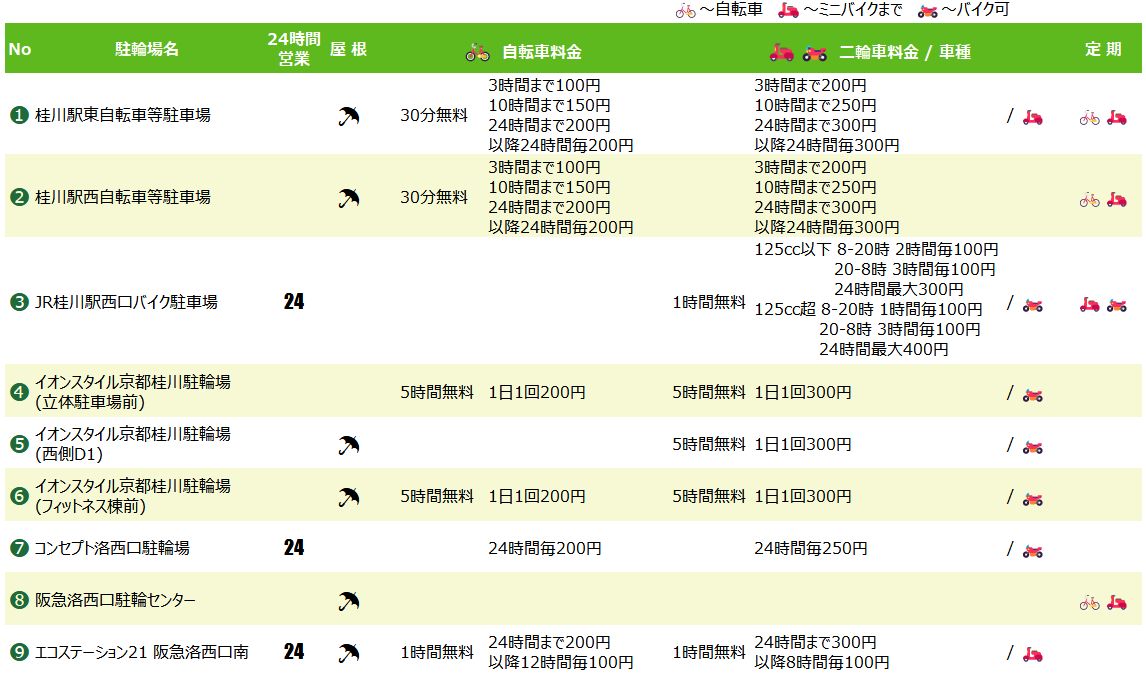 桂川駅・洛西口駅の駐輪場マップ&料金リスト