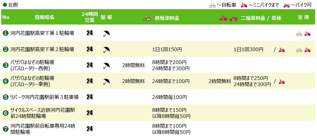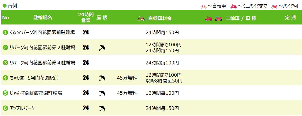 河内花園駅の周辺で自転車や原付・バイクの一時/定期利用ができる駐輪場を紹介します。