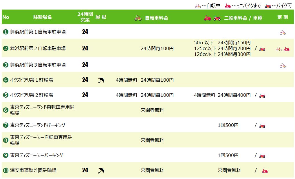 舞浜駅・東京ディズニーリゾートの駐輪場マップ&料金リスト