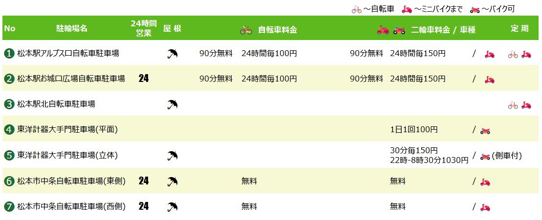松本駅の周辺で自転車や原付・バイクの一時/定期利用ができる駐輪場を紹介します。