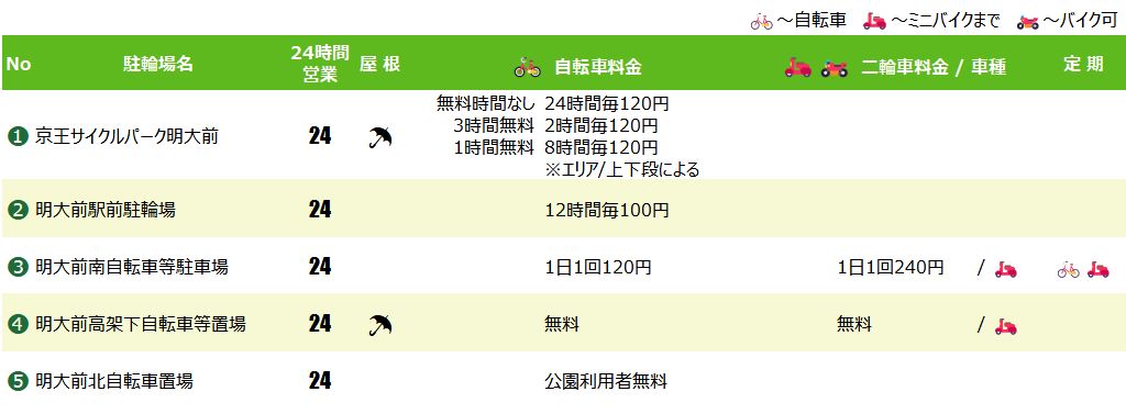 明大前駅周辺で自転車や原付・バイクの一時/定期利用ができる駐輪場を紹介します。