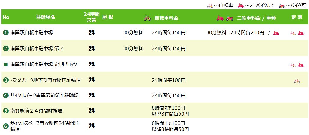 南巽駅の自転車・原付バイク駐輪場マップガイド!無料時間や定期可も紹介!