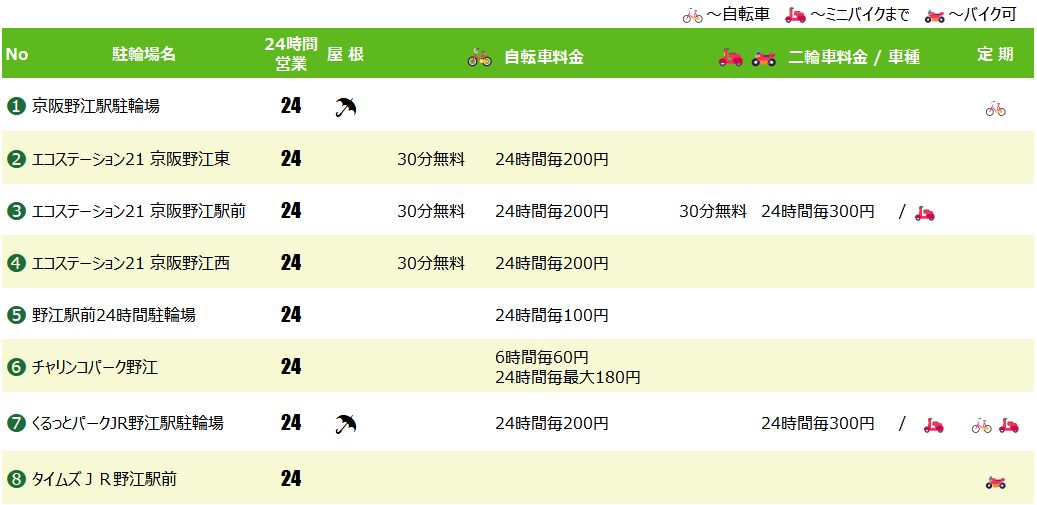 野江駅の周辺で自転車や原付・バイクの一時/定期利用ができる駐輪場を紹介します。