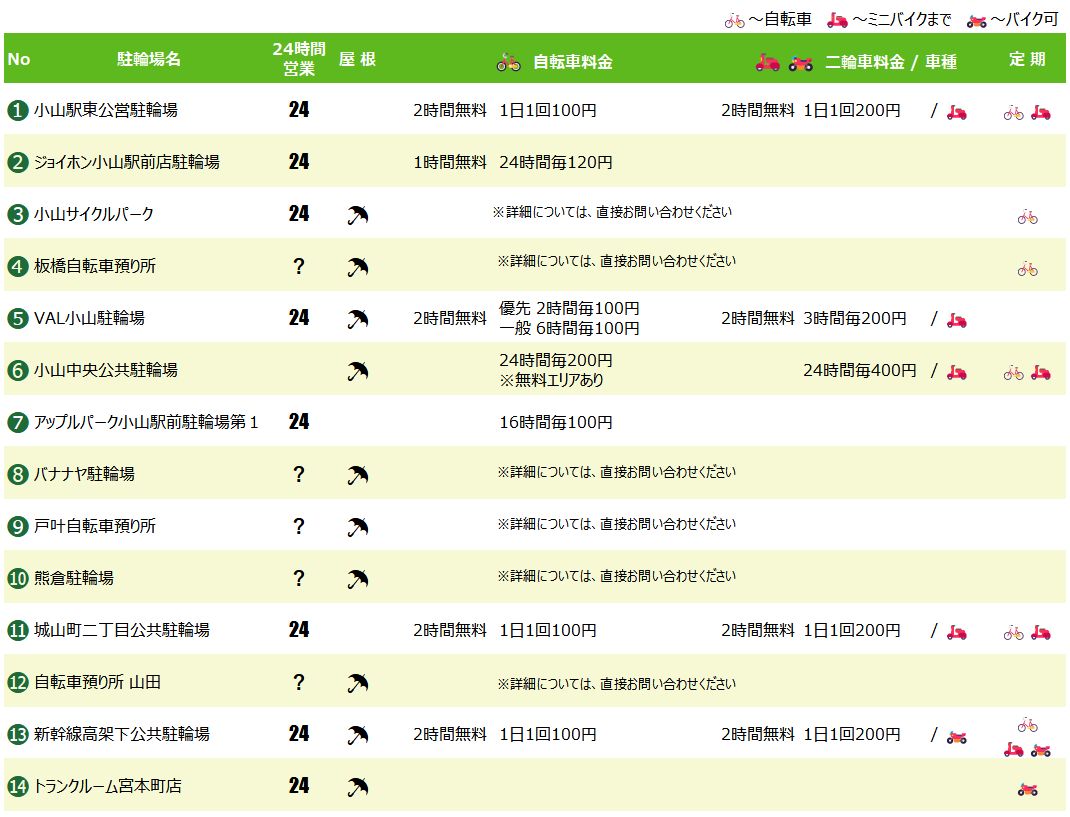 小山駅の駐輪場マップ&料金リスト