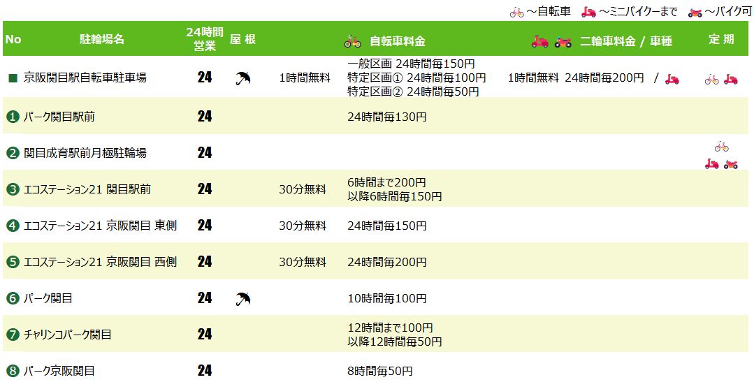 関目駅・関目成育駅の駐輪場マップ&料金リスト