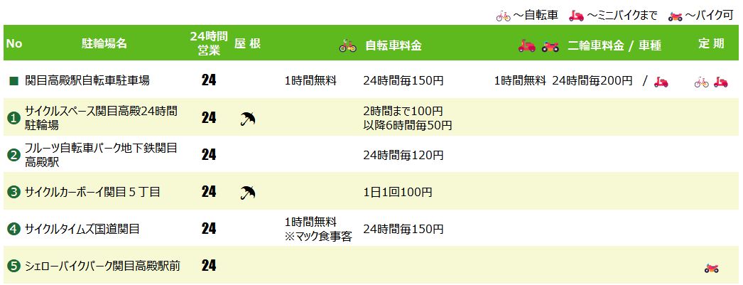 | 🚲 自転車 一時料金 | 1時間無料 24時間毎150円 |