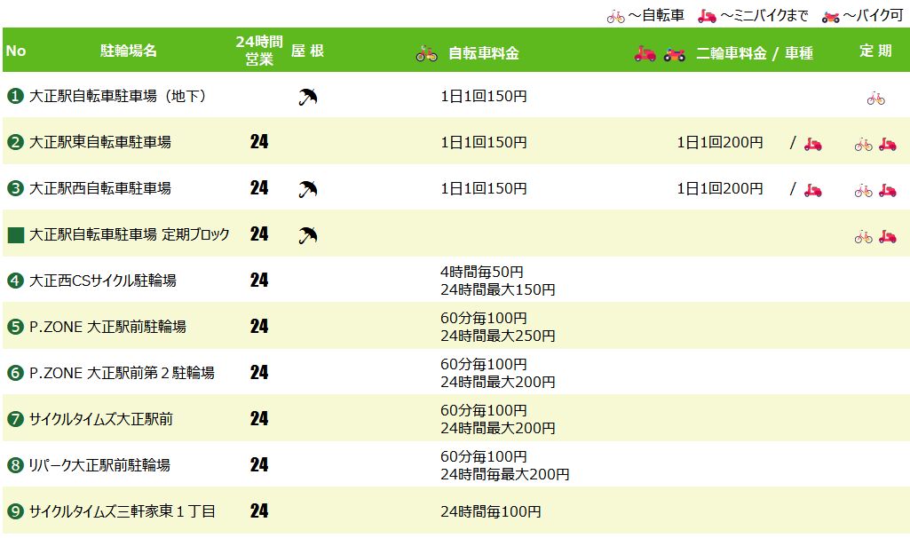 大正駅周辺で自転車や原付・バイクの一時/定期利用ができる駐輪場を紹介します。