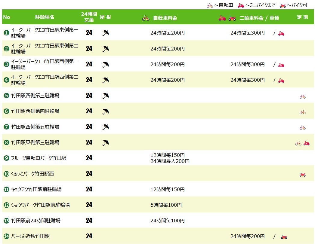 竹田駅の駐輪場マップ&料金リスト